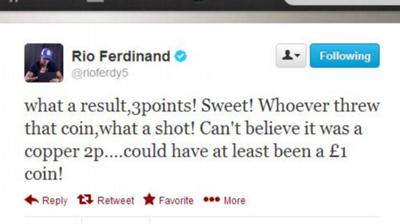 Θύμα του ο Ρίο Φέρντιναντ που δέχτηκε κέρμα, με συνέπεια να σκιστεί στο πρόσωπο και να αποχωρίσει αιμόφυρτος για τα αποδυτήρια.