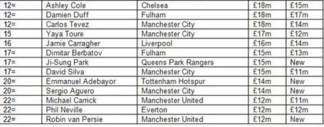 Οι πρωταθλητές της Πρέμιερ Λιγκ έχουν πιάσει τις 4 πρώτες θέσεις, αφού και ο Μάικλ Όουεν έχει φορέσει στο παρελθόν τα κόκκινα. Εντυπωσιακή πάντως είναι και η παρουσία της Τσέλσι, με 4 παίκτες της να ολοκληρώνουν την πρώτη 10άδα.