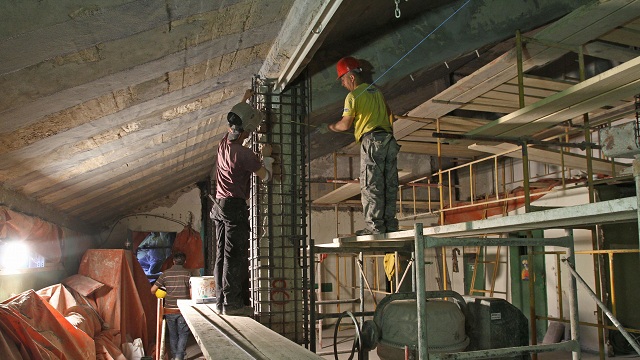 «Αυτό που κάνουμε είναι να αποκαθιστούμε αυτή τη στιγμή τα φέροντα στοιχεία στην προηγούμενη κατάστασή τους ενισχύοντας μόνο τοπικά, όπου έχουμε σοβαρά στατικά θέματα. Ενισχύσαμε τις κολώνες βάζοντας έναν οπλισμό, ενώ παράλληλα ενισχύσαμε και τα πέδιλά τους (σ.σ. τις βάσεις όπου πατάει η κολώνα) και αυξήσαμε τη διατομή τους. Παράλληλα στο πάνω μέρος των κερκίδων, ανοίχθηκαν κάποια σημεία, τα ενισχύουμε και τα καλύπτουμε με σκυροδέρματα και άλλα ειδικά κατασκευαστικά υλικά, τα οποία είναι αντιδιαβρωτικά. Στους οπλισμούς των στύλων, βάζουμε ειδικά πλέγματα πάνω στις πλάκες για την περαιτέρω ενίσχυσή τους. Σε γενικές γραμμές αυτό που προσπαθούμε να κάνουμε, είναι να αποκαταστήσουμε το γήπεδο, όπως ήταν όταν φτιάχτηκε. Και ακόμη καλύτερο».