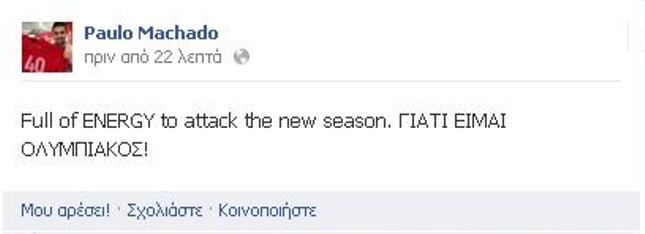 Ο Πορτογάλος μέσω της σελίδας του στο facebook θέλησε να στείλει το δικό του μήνυμα ενόψει της νέας αγωνιστικής περιόδου, τονίζοντας ότι είναι Ολυμπιακός, χρησιμοποιώντας με αυτόν τον τρόπο και το σύνθημα των νταμπλούχων Ελλάδας για τα εισιτήρια διαρκείας της νέας χρονιάς.