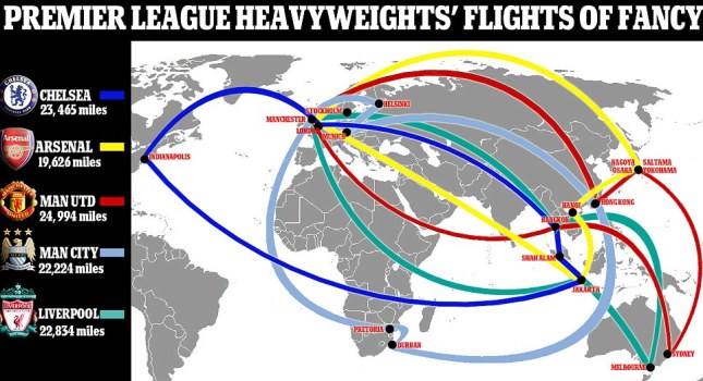 Συγκεκριμένα, η Τσέλσι σχεδόν διπλασίασε τα ταξίδια της σε σχέση με πέρυσι, αφού θα ταξιδέψει σε Μπανγκόνγκ, Κουάλα Λουμπούρ, Τζακάρτα, Ινδιανάπολη, Νέα Υόρκη και Μαϊάμι, ενώ η Άρσεναλ θα ξεκινήσει από Τζακάρτα, θα κάνει τουρνέ στην Ιαπωνία και θα καταλήξει στο Ελσίνκι.