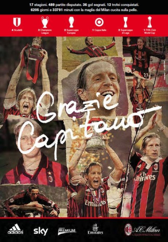 Δηλαδή 17 σεζόν, 489 συμμετοχές, 36 γκολ, 12 τρόπαια, 6205 μέρες και 33791 λεπτά με τη φανέλα της Μίλαν, 4 πρωταθλήματα, 2 Champions League, 2 Ευρωπαϊκά Σούπερ Καπ, 1 Κύπελλο Ιταλίας, 2 Σούπερ Καπ Ιταλίας, 1 Παγκόσμιο Πρωτάθλημα Συλλόγων. Πηγή: sport-fm.gr