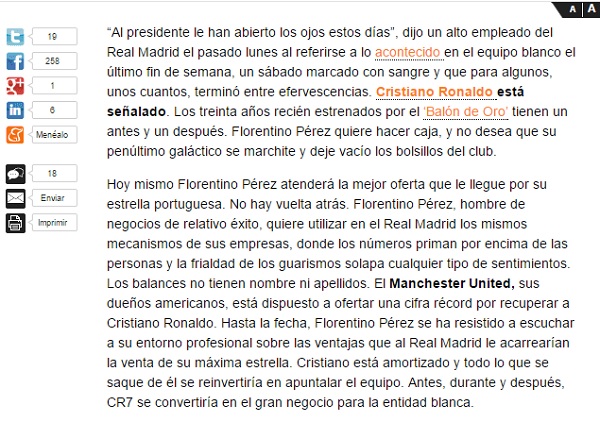 «Ο Πέρεθ άνοιξε τα μάτια του αυτές τις ημέρες» σχολίασε σχετικά η πηγή των Ισπανών, μετά τη ντροπιαστική ήττα της ομάδας του Κάρλο Αντσελότι από την συμπολίτισσα Ατλέτικο στο «Καλντερόν», με το δημοσίευμα να παρουσιάζει τον πρόεδρο της Ρεάλ ως σκληρό επαγγελματία που δεν θα κρατήσει τον Ρονάλντο για πάντα στον σύλλογο καθώς έχει ήδη μεγαλώσει αλλά και βάζοντας μπροστά το οικονομικό του συμφέρον.