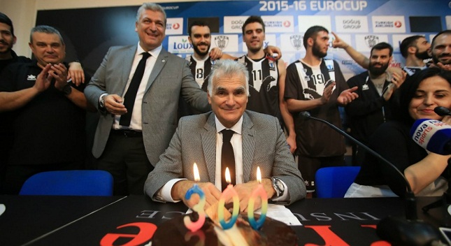 Ο κόουτς του ΠΑΟΚ ήταν χαρούμενος για τη νίκη επί της Σζολνόκι, με την οποία έκλεισε 300 ματς στον πάγκο της ομάδας. Οι παίκτες του φρόντισαν να τον κάνουν να «σκάσει» ακόμη ένα χαμόγελο, όταν μπούκαραν με μια τούρτα στην αίθουσα Τύπου.