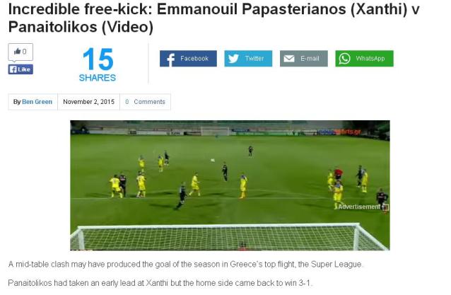Η απίθανη εκτέλεση φάουλ του Παπαστεριανού στον αγώνα Ξάνθη-Παναιτωλικός είναι υποψήφια για καλύτερο τέρμα της χρονιάς. Και μια τέτοια γκολάρα δεν θα μπορούσε να μην ξεπεράσει τα σύνορα.