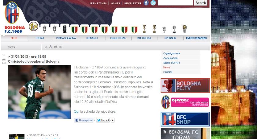 «Η Μπολόνια 1909 ανακοινώνει ότι ήρθε σε συμφωνία για την απόκτηση του δεξιού μεσοεπιθετικού Λάζαρου Χριστοδουλόπουλου, ο οποίος ανήκει πλέον στους “ροσομπλού”. Ο παίκτης έχει γεννηθεί στη Θεσσαλονίκη στις 19 Δεκεμβρίου του 1986 και εκτός από τον Παναθηναϊκό, έχει φορέσει και τη φανέλα του ΠΑΟΚ».