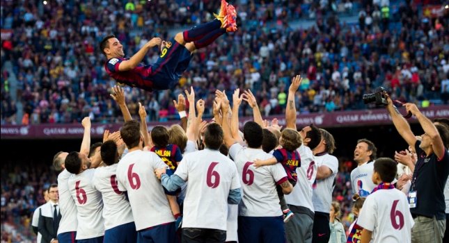Picture: Xavi thrown up in the air by teammates after the game #fcblive [via @baarca_af] pic.twitter.com/aRzC3PZ4cQ