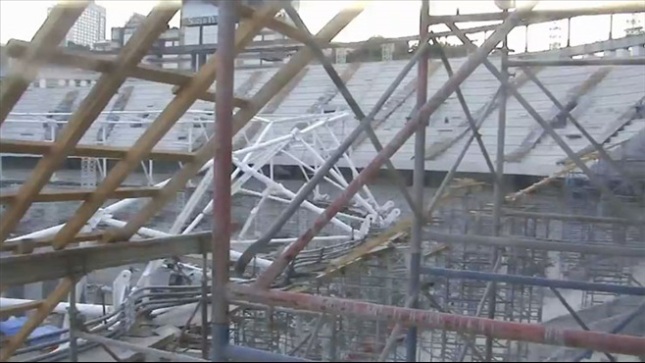 Μεγάλο μέρος της σκαλωσιάς που στηρίζει το σκέπαστρο της «Vodafone Arena» κατέρρευσε με αποτέλεσμα να τραυματιστούν δύο εργάτες. Και οι δύο νοσηλεύονται, ευτυχώς εκτός κινδύνου, σε νοσοκομείο της Κωνσταντινούπολης.